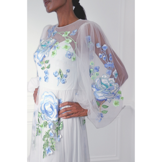 Monique Lhuillier Blue Floral Mesh Long Sleeve Gown, 4 (AS IS)