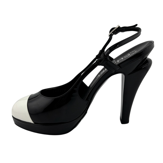 Chanel Black & White Cap Toe Patent Slingback Heel, 35