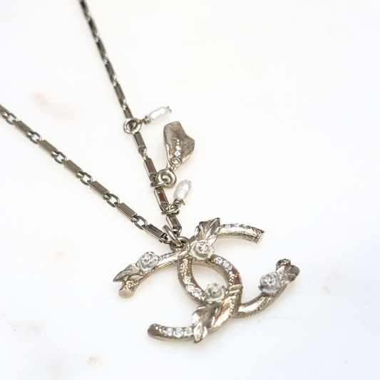 Chanel Gold CC Leaves & Flowers Pearl Charm Necklace
