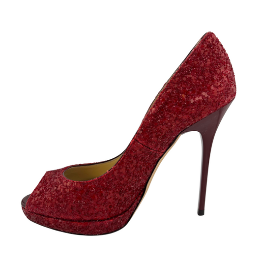 Jimmy Choo Red Glitter Peep Toe Pumps, 35