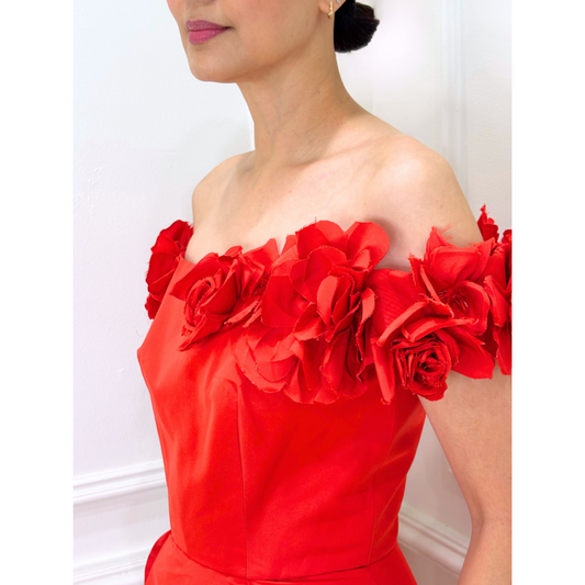 Monique Lhuillier Red Floral Column Off Shoulder Gown, 6