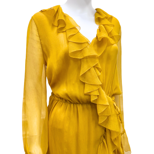 Saint Laurent Mustard Yellow Silk Ruffle Wrap Dress, 42